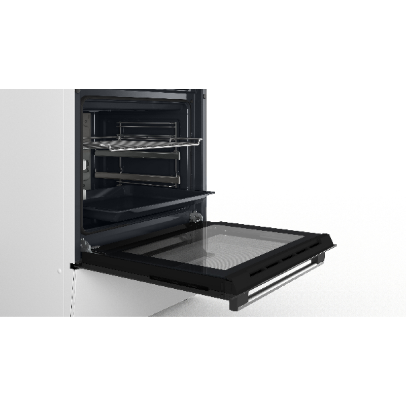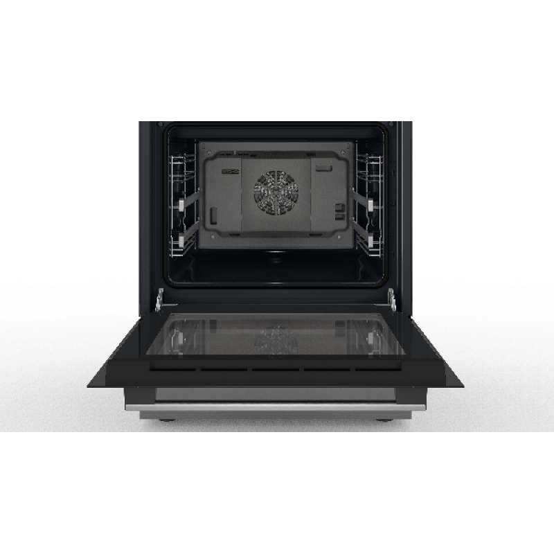 Deze elektrische Bosch HKR39C250 fornuis combineert een kookplaat en een oven in één apparaat en voldoet daarmee aan al je culinaire behoeften. Met zijn roestvrijstalen ontwerp past hij harmonieus in elke moderne keuken. Hij heeft afmetingen van (H x D x B) 85 x 60 x 60 cm en is eenvoudig vrijstaand te installeren. Hij bestaat uit een keramische kookplaat, een oven van 66 liter en een handige opberglade. Hij is eenvoudig te bedienen met behulp van de 6 draaiknoppen aan de voorkant en het kleine zwarte digitale scherm met rode LED-display laat je duidelijk zien welke kookmodus je hebt gekozen.