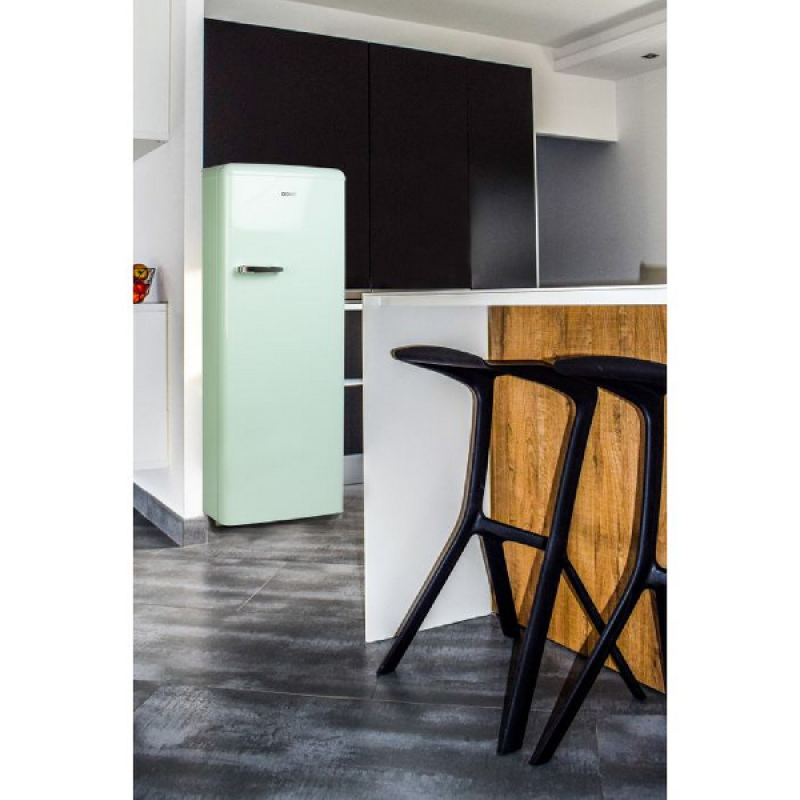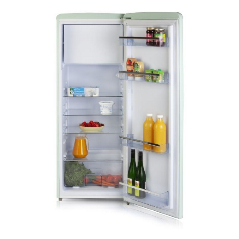 Nostalgie alom met deze retro koelkast DO91701R van DOMO. Het vintage design heeft afgeronde hoeken, een retrolook handgreep en een zachte muntgroene kleur. Met een inhoud van 218 liter is deze koelkast perfect voor het koelen van boodschappen van een gezin van 3 à 4 personen. Het koelgedeelte van 194 l is opgedeeld door 4 glazen leggers, een groentelade en 4 deurvakken. Bovendien heeft de koelkast ook een 3 sterren vriesvak van 24 l, ideaal voor je diepvriespizza of ijsjes!
