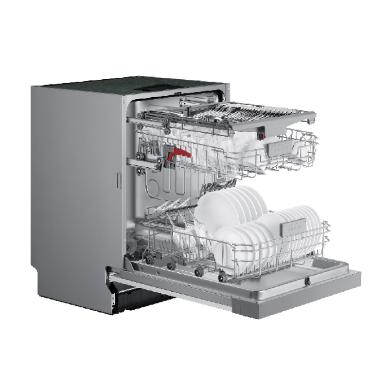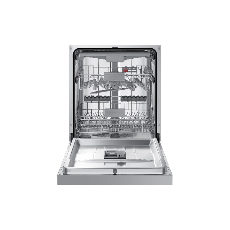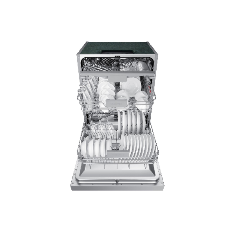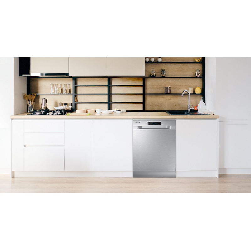 De witte Samsung DW60CG550SSRET is een stille en veelzijdige semi geïntegreerde vaatwasser met Express Wash en 7 functionele wasprogramma’s. Dankzij zijn elegante design en praktische constructie past deze vaatwasser naadloos in elke moderne keuken. Binnenin vind je twee verstelbare korven met Flex Load en Auto Adjust voor het veilig opbergen van je borden, schotels, glazen en bekers en groter servies. Je kunt de pijlen inklappen voor een praktische indeling van je vaat met behulp van de hendel aan de achterkant. Bovenaan bevindt zich een 3de lade waar je plaats hebt voor je messen, vorken, lepel en ander Bovendien blijft de binnenkant van je afwasmachine proper en hygiënisch dankzij de Self Clean en Hygiene Care-functie. Zo verwijdert dit apparaat vuil en geurtjes verwijdert zonder gebruik te maken van agressieve schoonmaakmiddelen en het hygiënisch spoelproces verwijdert ziektekiemen en bacteriën. Met zijn energieklasse D mag je daarbovenop gerust zijn dat dit apparaat minder energie verbruikt, zonder afbreuk aan de prestaties te doen en je altijd van een propere vaat kunt genieten.