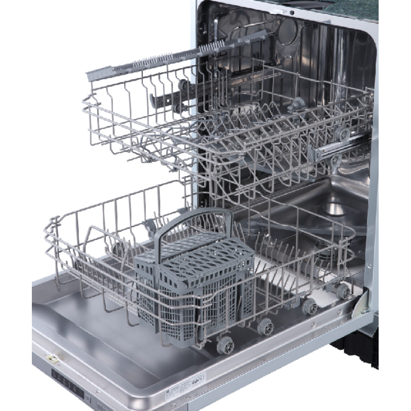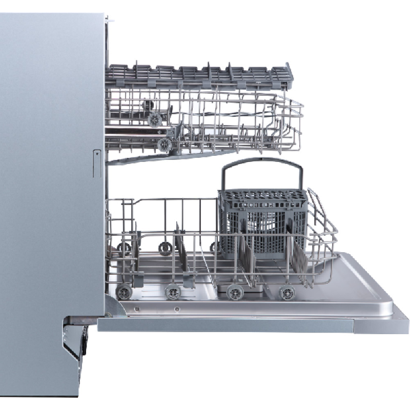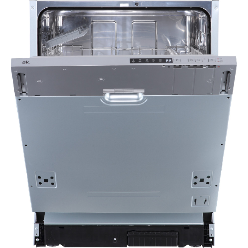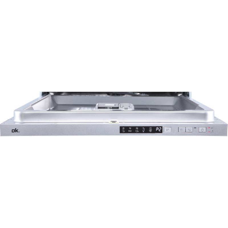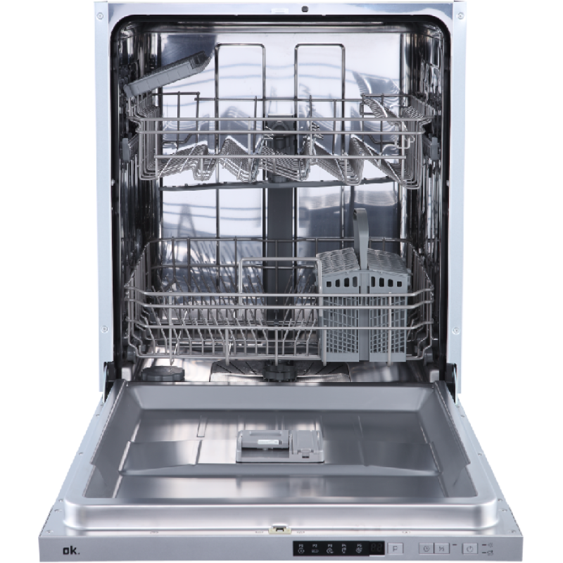 Met deze inbouwvaatwasser biedt OK een modern en efficiënt toestel met een roestvrij stalen binnenkant. Dankzij zijn standaardafmetingen installeer je hem eenvoudig in elke keuken. Hij heeft een capaciteit van 14 couverts, ideaal van een gezin van 4 tot 6 personen, waardoor je hem niet vaak hoeft te laten draaien. Binnenin is hij uitgerust met 2 uitneembare manden. Een in hoogte verstelbaar bovenrek voor glazen en kopjes met 2 flexibele vakjes voor kleine kopjes. En een onderrek voor borden en grote schalen met een uitneembaar bestekmandje.