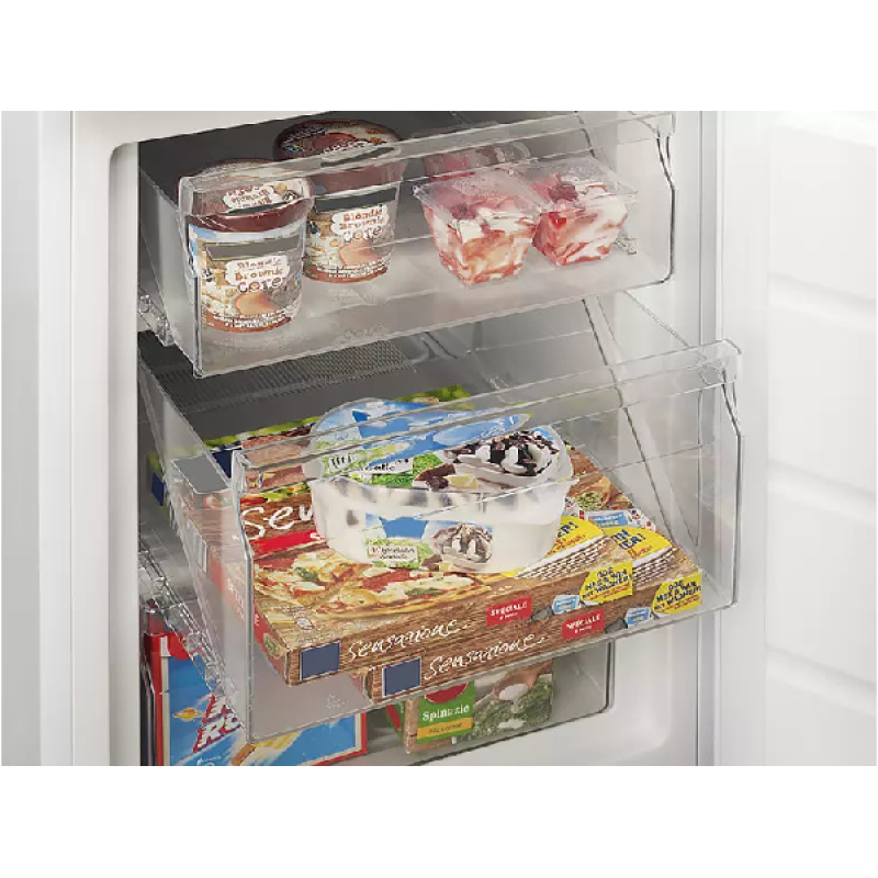 De Koenic KFZ116E is een vrijstaande vriezer van tafelmodel-formaat met een inhoud van 85 liter. De ruimte is verdeeld over drie lades, waarvan de middelste het grootst is. Op de deur is een externe handgreep te vinden, waarmee je het apparaat gemakkelijk opent en sluit. Bovendien is de draairichting van de deur naar wens aanpasbaar. Hierdoor sluit deze altijd aan bij de indeling van jouw keuken. Valt de stroom een keer uit? Dan houdt de KFZ116E jouw diepvriesproducten tot wel 15 uur ingevroren. Dit zit in de verpakking: Vriezer, vrieslades, handgreep en een gebruikershandleiding.