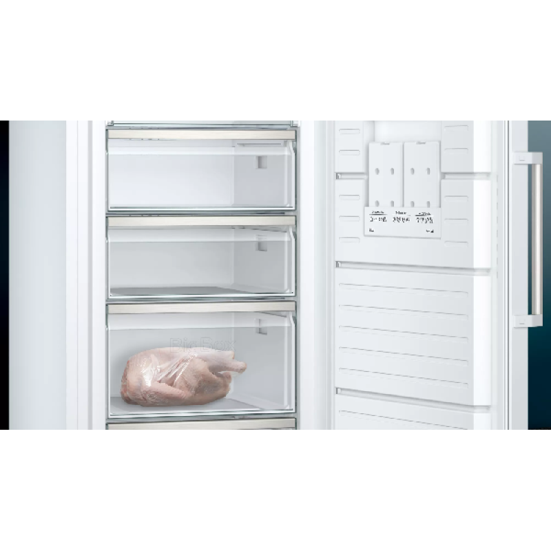 Als je op zoek bent naar een XXL-diepvriezer met alle toeters en bellen, dan is deze witte diepvrieskast GS58NAWEV van Siemens de perfecte oplossing. Met zijn extra brede vrieslade voor grotere producten kan je er gemakkelijk stapels pizza's of een volledige kalkoen in kwijt.