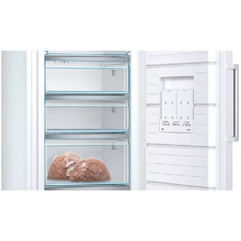 Deze Bosch vriezer is voorzien van "No Frost" technologie, wat de vorming van ijs en daarmee ontdooisessies voorkomt. De kartonnen dozen plakken niet aan elkaar en het invriezen van etenswaren gaat sneller. Deze technologie, die beschermt tegen ijsvorming, bespaart tijd en energie. Dit apparaat heeft een C energie-efficiëntieklasse en verbruikt slechts 170 kWh per jaar. Naast energiezuinig is de vriezer ook erg stil: hij produceert slechts 38dB aan geluid.