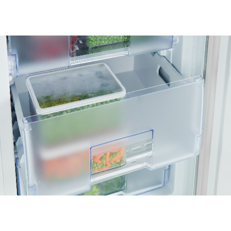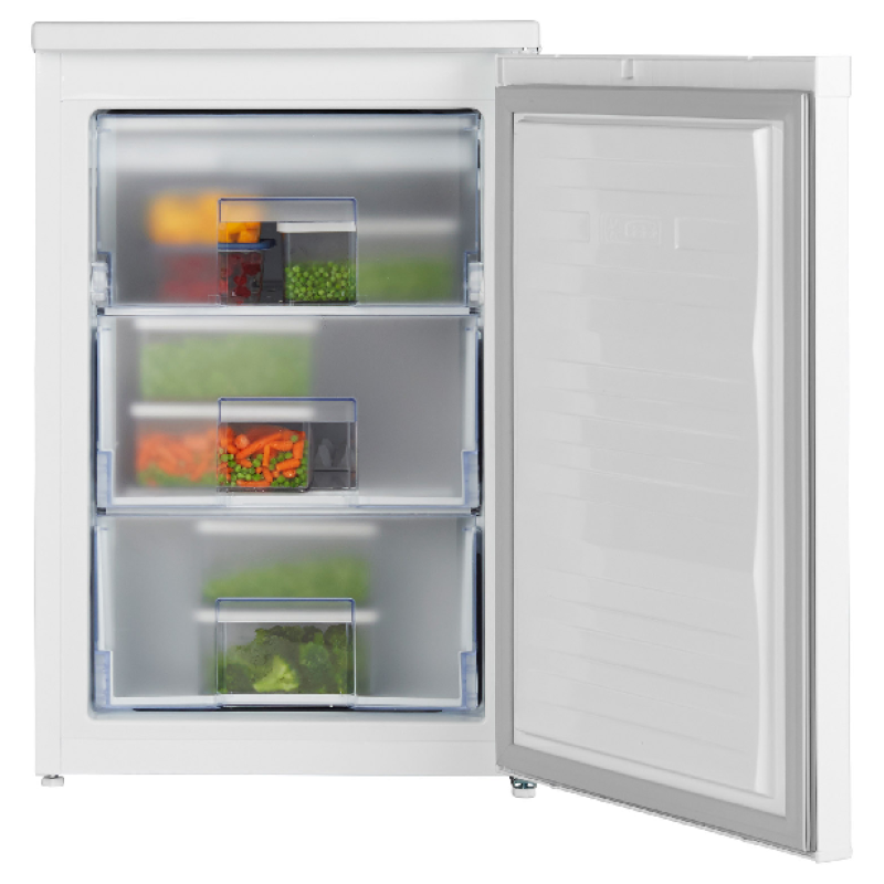 Voor kleine keukens of als extra vriezer in een bijkeuken of garage komt deze witte tafelmodel vriezer van BEKO goed van pas. Hij is eenvoudig vrijstaand te installeren en vindt, met zijn compacte afmetingen van 54 x 84 x 59 cm, probleemloos zijn plekje in een hoek of onder een werkblad. Deze diepvriezer heeft een inhoud van 95 liter, verdeeld over 3 compartimenten - 2 lades en een legplank met klep - elk met een transparante voorkant zodat je gemakkelijk kan zien wat erin zit. De deur is omkeerbaar, om de opening aan de indeling van je keuken aan te kunnen passen.