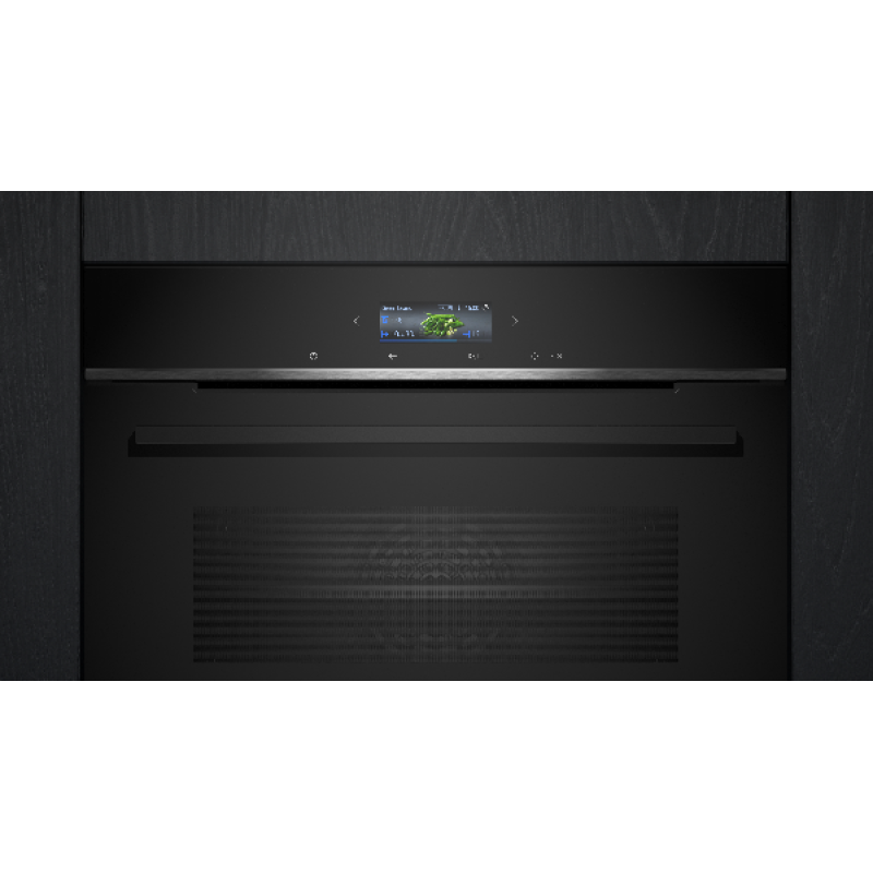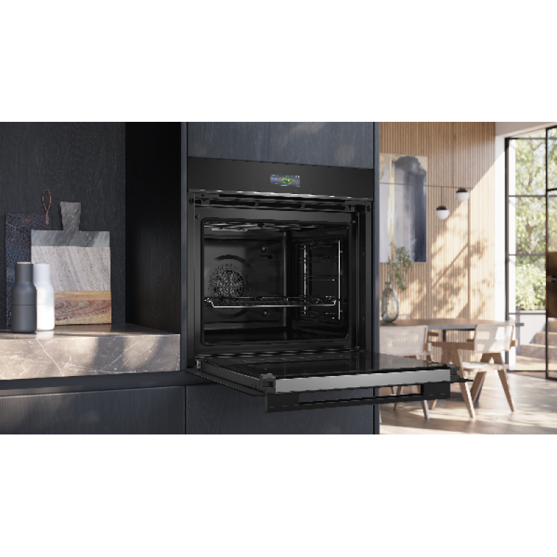 De Siemens HB774G1B1 inbouwoven in zwart biedt tal van functies om je favoriete gerechten te bereiden. Dankzij de elegante zwarte afwerking integreert hij perfect in een moderne en verfijnde keuken. Met een inhoud van 71 liter is er voldoende ruimte voor grote schotels, ideaal voor gezinnen of kookliefhebbers. Het TFT-touchscreen zorgt voor een intuïtieve navigatie en een aangename dagelijkse bediening. De viervoudig glazen koele deur garandeert bovendien optimale veiligheid door de buitentemperatuur laag te houden, zelfs bij hoge baktemperaturen.