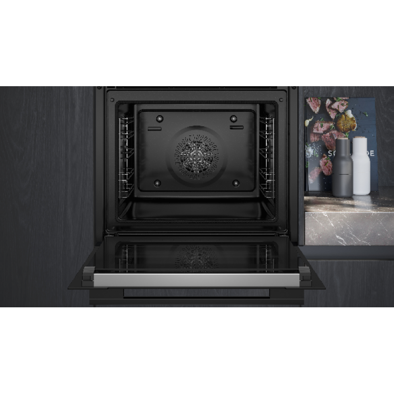 Reinigen wordt bijzonder eenvoudig dankzij de pyrolysefunctie, die voedselresten bij hoge temperatuur tot as verbrandt, en humidClean Plus, dat met stoom lichte vervuiling losweekt. Deze 2 systemen zorgen voor een schone oven met minimale inspanning. De oven wordt geleverd met een rooster, een geëmailleerde bakplaat en een vetopvangschaal die geschikt zijn voor pyrolyse. De viervoudig glazen koele deur in combinatie met softMove zorgt voor soepel openen en sluiten, terwijl de koelventilator de buitenkant veilig op temperatuur houdt, zelfs na langdurig gebruik.