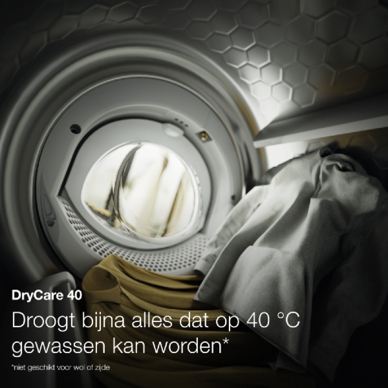 (+) Gemengd drogen zonder vooraf te sorteren: met het programma DryCare 40 droog je al je kleding van diverse materialen snel en optimaal.