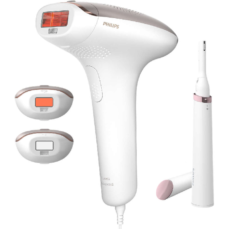Dit toestel is ontworpen voor optimale veelzijdigheid en werkt doeltreffend op zowel lichaam als gezicht. Hij behandelt met gemak de benen, armen, buik, bikinilijn, oksels alsook de gevoelige gezichtszones. Hiervoor is hij uitgerust met 3 unieke opzetstukken: één breed opzetstuk voor de uitgestrekte lichaamszones, één voor een nauwkeurige gezichtsbehandeling en één specifiek voor de bikinilijn. Ook een Satin Compact trimmer, geschikt voor de neus, oren en wenkbrauwen, is inbegrepen. Al deze accessoires, plus een opbergtasje en een reinigingsdoekje, maken dit pakket compleet.