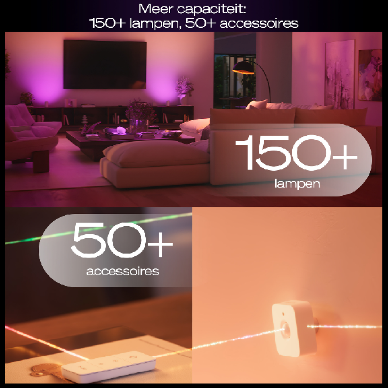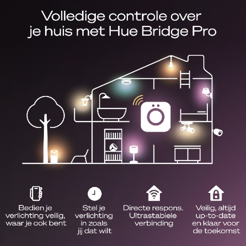 Controlestation Philips Hue Bridge Pro in zwart is het kastje dat je nodig hebt om Philips Hue lampen en accessoires met elkaar te verbinden en te bedienen. Je sluit de Bridge aan op je wifi-router en vanaf dat moment regel je via de Hue-app alle lampen in huis met je telefoon of tablet. Zo kun je bijvoorbeeld lampen dimmen, scènes instellen of timers gebruiken. De Bridge ondersteunt meer dan 150 lampen en 50 accessoires en werkt via Zigbee, een speciaal netwerk dat apparaten in huis draadloos en betrouwbaar met elkaar laat communiceren. Het compacte formaat van 9x9x2 cm plaats je gemakkelijk overal.