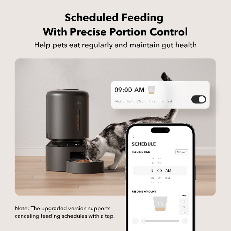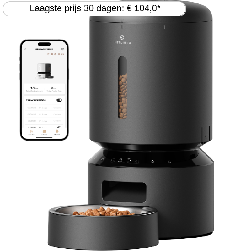 Met deze zwarte Granary voerdispenser van Petlibro krijgen je huisdieren altijd op hetzelfde moment eten, zelfs als je niet thuis bent. Dit model heeft een inhoud van 5 liter. Dit betekent dat je een grote hoeveelheid brokjes kunt bewaren, die droog blijven dankzij het ingebouwde vershoudfilter. Hij is eenvoudig te programmeren via het intuïtieve bedieningspaneel aan de onderkant van de dispenser of je bedient hem op afstand via de Petlibro-app. Je kunt de portiegrootte instellen - van 1 tot 50 gram - en het aantal porties per dag. De dispenser heeft een infraroodsensor om te voorkomen dat de brokjes niet overlopen. Hij werkt op stroom, maar is ook voorzien van een back-upbatterij die een continue stroomvoorziening garandeert, zelfs als de stroom uitvalt. Je ontvangt automatisch een waarschuwing op je smartphone als er te weinig voer is, wanneer de voederautomaat niet goed functioneert, wanneer de batterij bijna leeg is of als het voer verstopt raakt. Tot slot zijn alle onderdelen van de automaat afneembaar voor eenvoudig onderhoud. Zo is deze voerdispenser een praktische, betrouwbare oplossing voor het welzijn van je huisdieren.