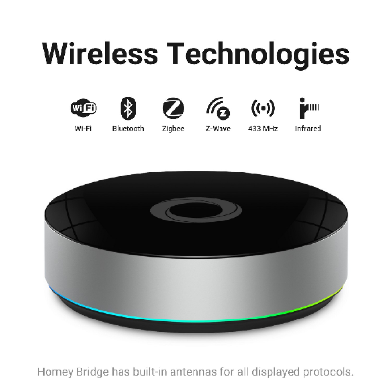 De Homey Bridge is voorzien van alle relevante communicatieprotocollen, zodat al jouw apparaten moeiteloos met elkaar communiceren. Koppel je apparaten dus niet alleen via wifi en bluetooth, maar ook via Zigbee, Z-wave, 433MHz-signalen en infraroodsignalen. Zonder abonnement koppel je maximaal 5 apparaten. Heb je meer smarthome-apparaten in huis? Neem dan een Homey Premium-abonnement om een onbeperkt aantal apparaten aan de bridge te koppelen en toegang te krijgen tot Homey Insights, Logica en Variabelen. Zo houd jij nog makkelijker de controle. Wanneer je de bridge koopt, kun je Premium 3 maanden kosteloos uitproberen.