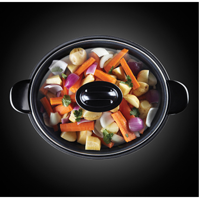 Geef extra smaak en textuur aan langzaam gegaarde maaltijden met de aluminium bakpan in de slowcooker, die je ook direct op het vuur kunt zetten. Als je bijvoorbeeld vlees hebt aangebraden, plaats je de pan daarna gewoon weer terug in de slowcooker om verder te garen. Drie handige temperatuurinstellingen maken slowcooking nog gemakkelijker en zorgen dat niks kan mislukken.