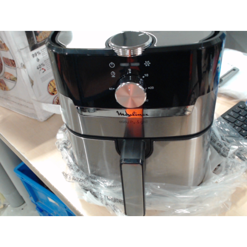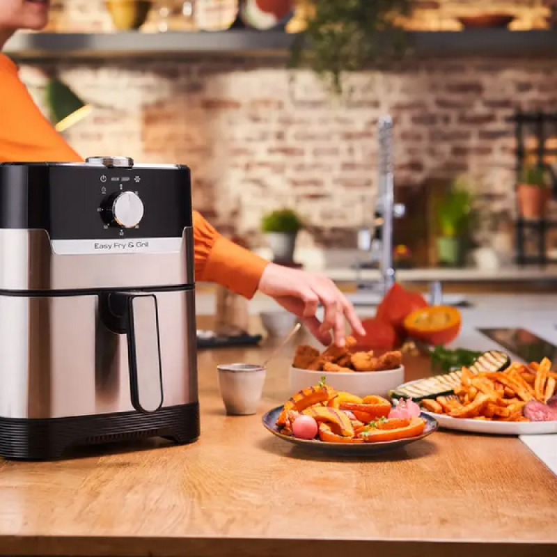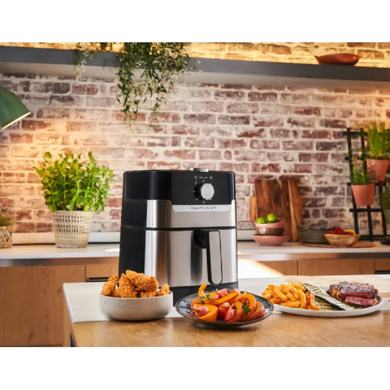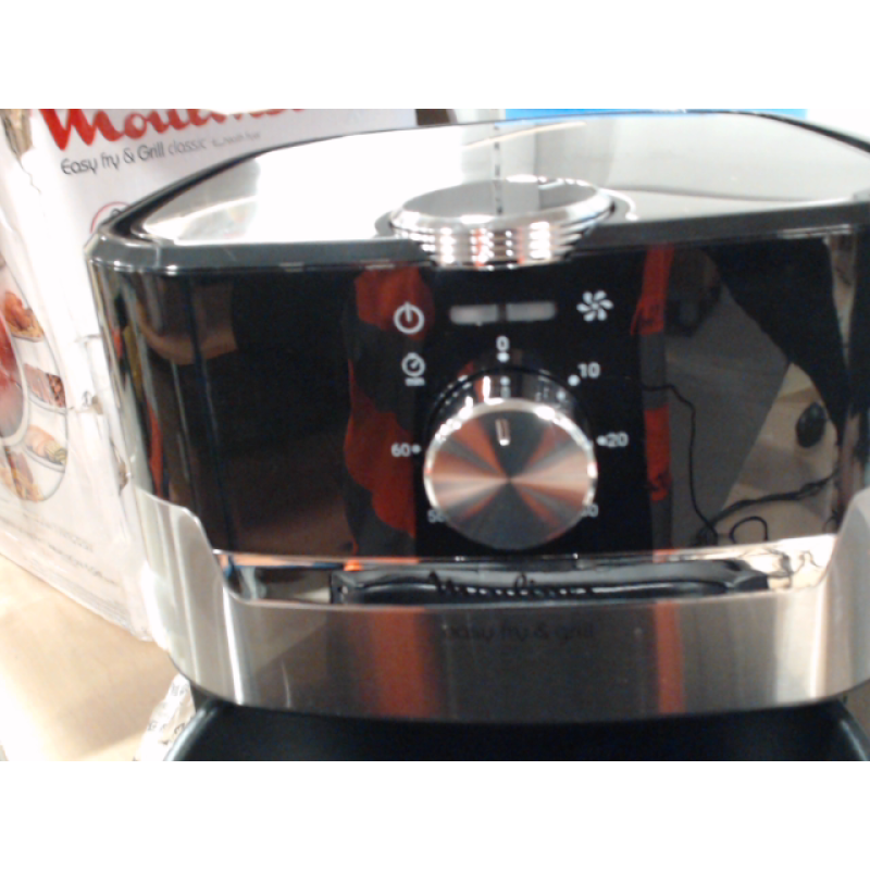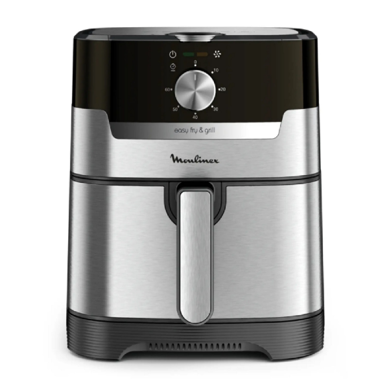 De zwarte en zilverkleurige Airfryer Easy Fry & Grill Meca van Moulinex combineert een olievrije friteuse met een barbecue en laat je gezond koken met weinig of geen olie. Resultaat: knapperige frietjes en perfect gegaard vlees en groenten. Dit apparaat belooft snelle resultaten en een laag energieverbruik en is het ideale alternatief voor een conventionele oven.