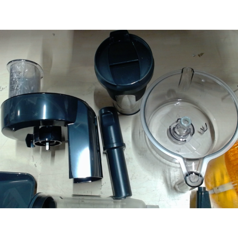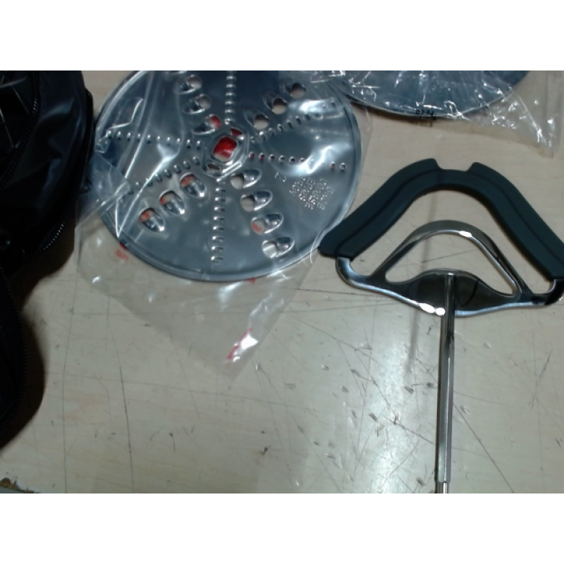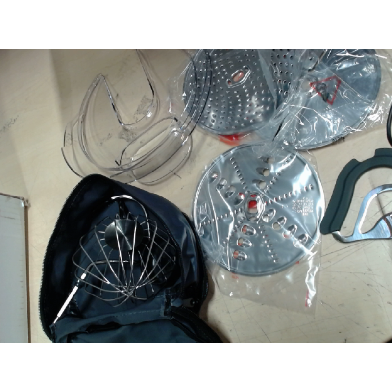 Accessoireaansluiting deksel, groentesnijder, roestvrijstalen mengkom, vleesmolen, metalen kneedhaak, kunststof mixerbeker, tweezijdige raspschijf, middelfijne raspschijf, tweezijdige snijschijf, citruspers