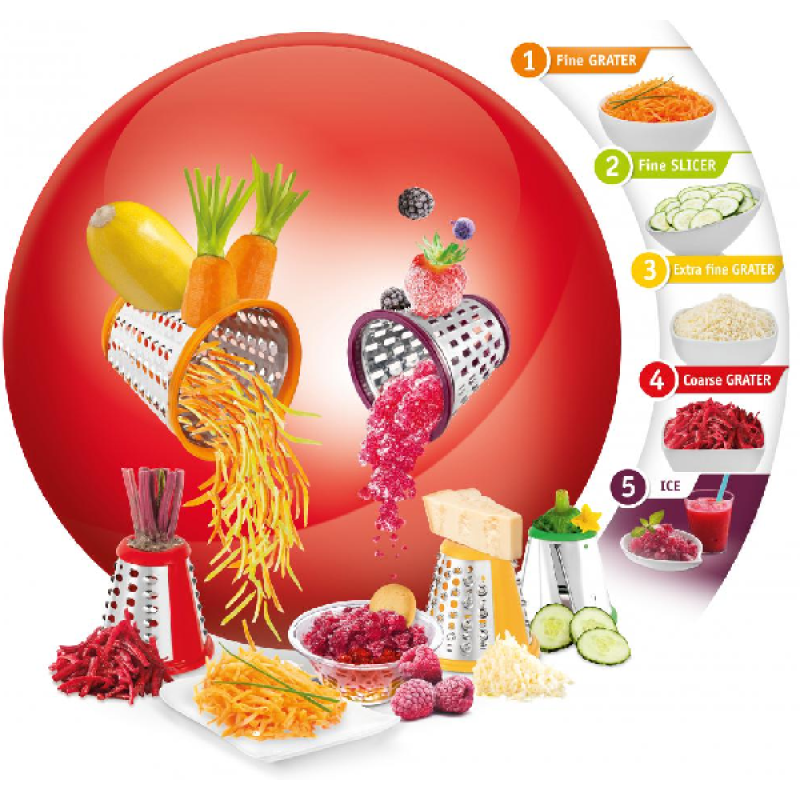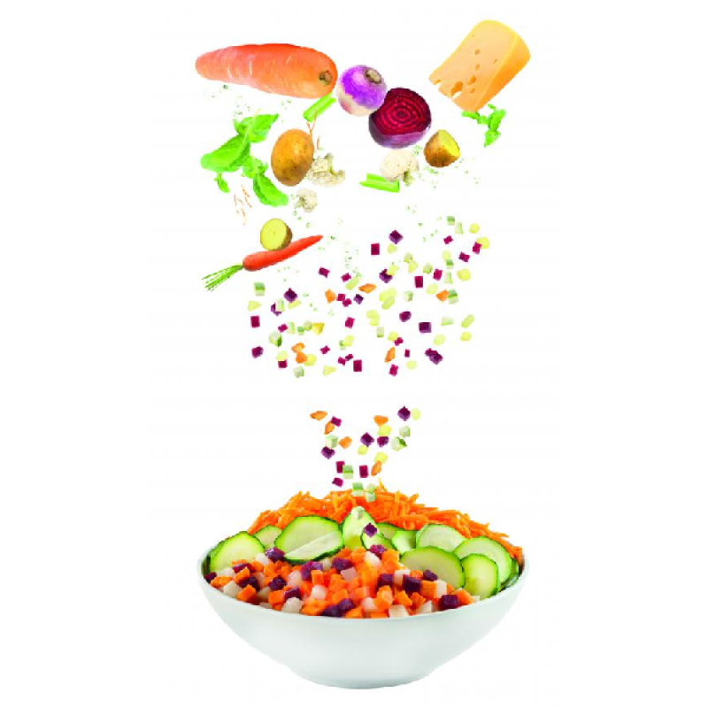 5 kegels om groenten, fruit, kaas en chocolade grof of fijn te hakken, te raspen of ijs te vermalen. Het voedsel komt rechtstreeks op je bord terecht, klaar om op te dienen.