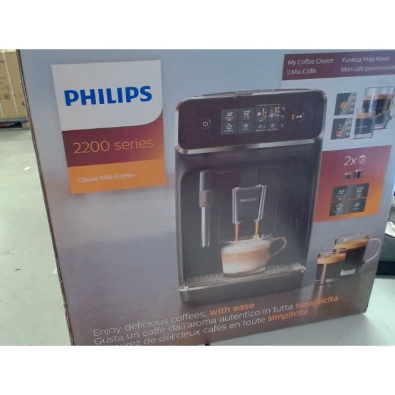 De PHILIPS Series 2200 is een slanke, matzwarte en volautomatische espressomachine met een klassieke melkopschuimer voor cappuccino en latte macchiato. Hij is uitgerust met een intuïtief touchdisplay en een automatisch ontkalkingssysteem voor onderhoudstaken.