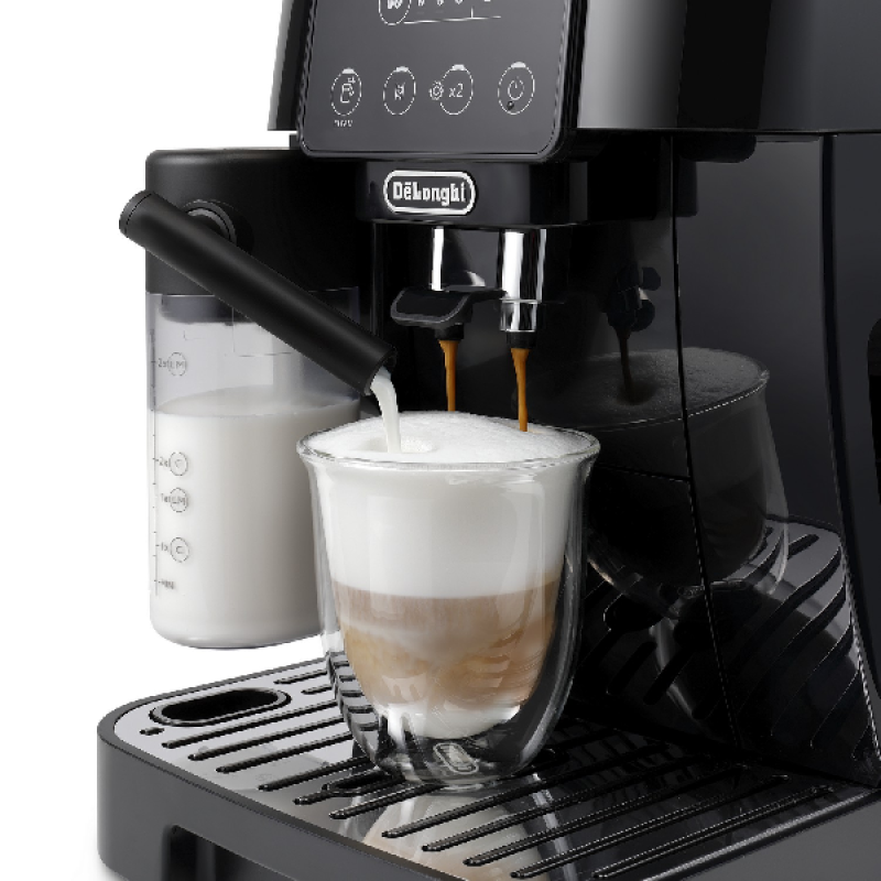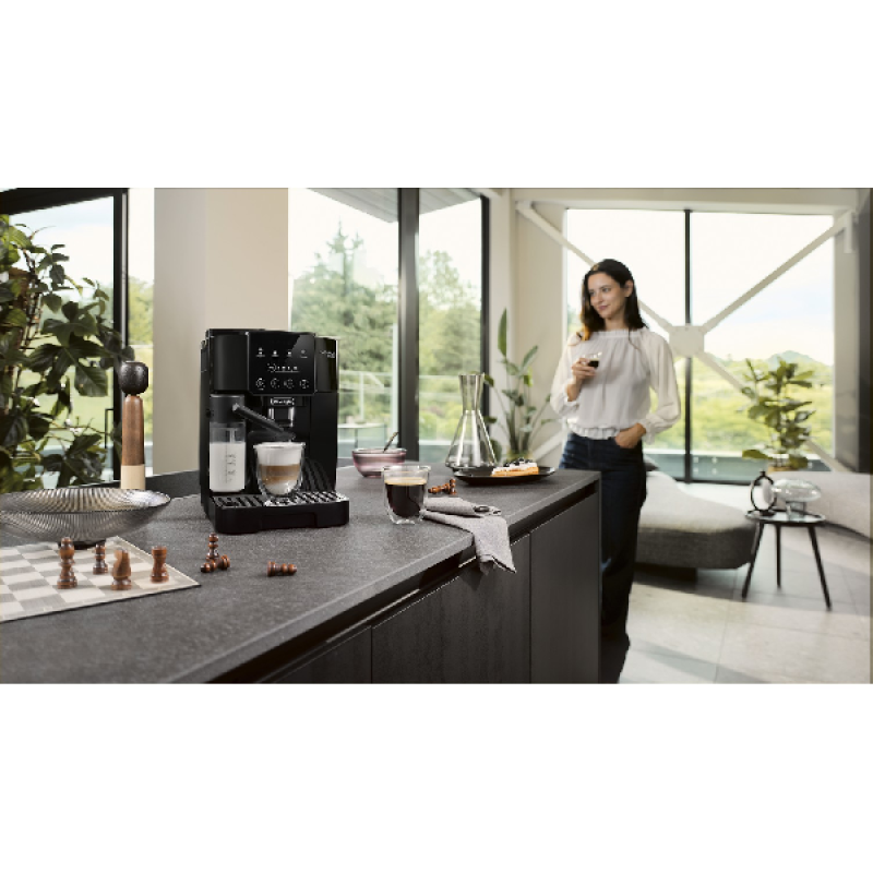De Magnifica Start ECAM220.60.B is een volautomatische espressomachine met 2-kops-functie met een strak zwart design dat naadloos in elke moderne keuken past. Met zijn afmetingen van 24 x 44 x 35 cm (B/D/H) en een gewicht van 8,8 kilo is het een solide apparaat dat stabiliteit biedt tijdens het zetten van je koffie. Het bonenreservoir bovenop de machine heeft een capaciteit van 250 gram, waardoor je eenvoudig koffiebonen kunt bijvullen zonder te morsen, en het waterreservoir van 1,8 liter is voldoende voor meerdere koppen koffie zonder frequent te hoeven bijvullen. Tot slot maakt de maximale kophoogte van 14 cm het mogelijk om diverse kopgroottes te gebruiken, van espressokopjes tot grotere mokken.