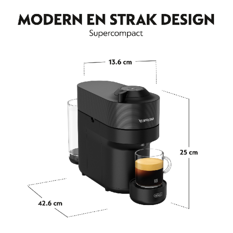 Met afmetingen van slechts 42,6 x 13,6 x 25 cm, heeft deze kleine automatische koffiemachine een compact formaat en vindt gemakkelijk een plekje op je werkblad. Zij heeft een afneembaar waterreservoir met een capaciteit van 600 ml, dat gemakkelijk te verwijderen en bij te vullen is. Het reservoir bevindt zich discreet aan de achterkant van het apparaat. Het capsule-opvangbakje aan de voorkant heeft een capaciteit van 8 tot 10 capsules en is gemakkelijk te legen. De Vertuo Pop is zeer eenvoudig te gebruiken, met de individuele capsules en één knop om het koffiezetten te starten.
