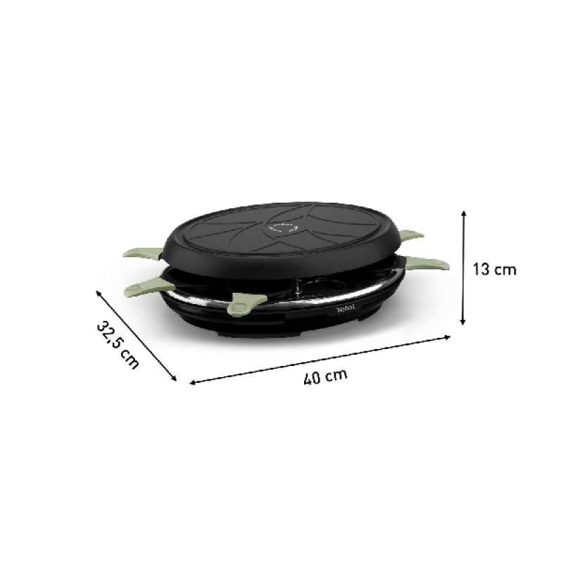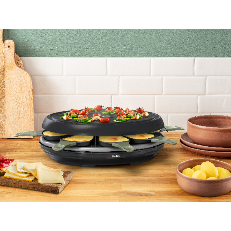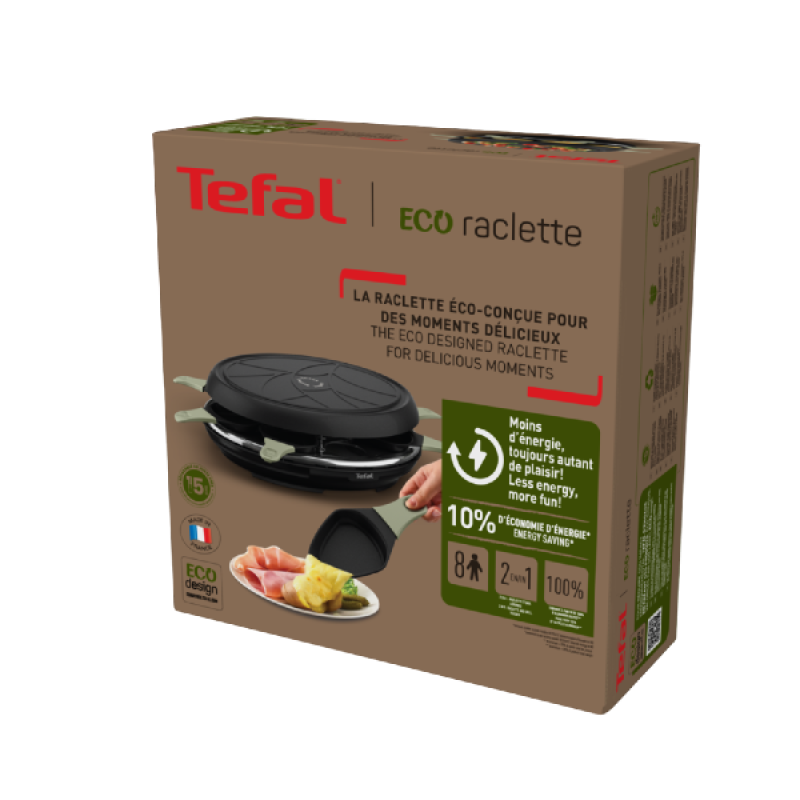 • MILIEUVRIENDELIJK ONTWERP: 10% lager energieverbruik (vergeleken met Raclette Tefal RE310412), een 95% recyclebaar ontwerp (mogelijke recyclebaarheid, te sorteren in de voorziene faciliteiten) en een recyclebare verpakking zonder plastic, gemaakt van 90% gerecyclede vezels