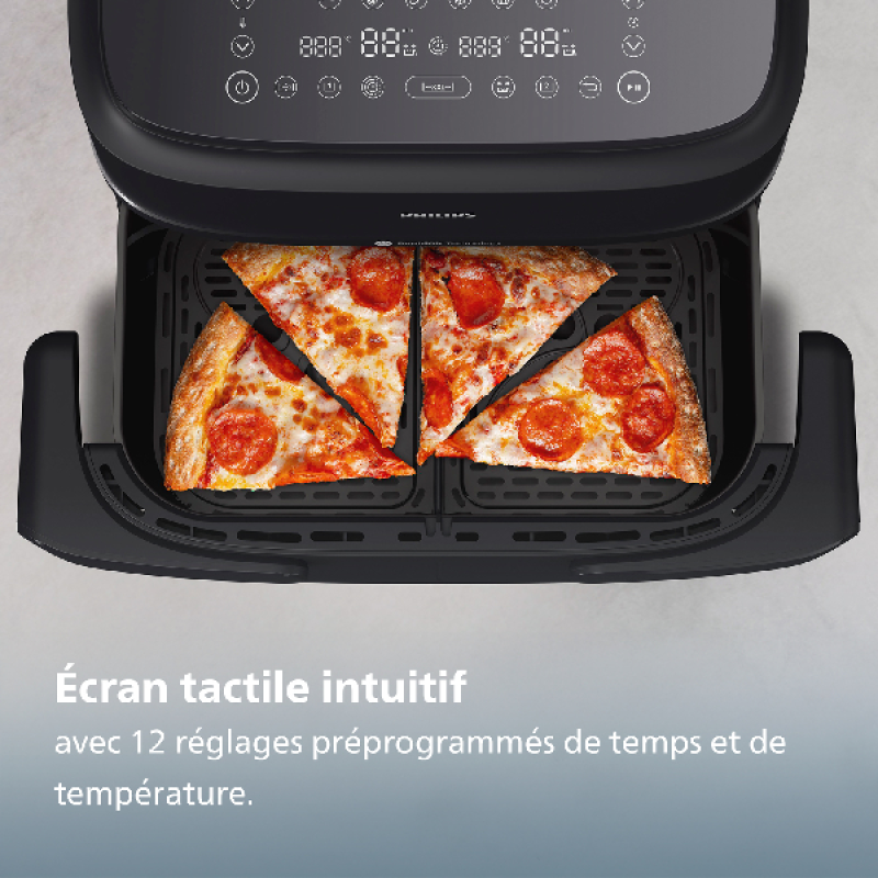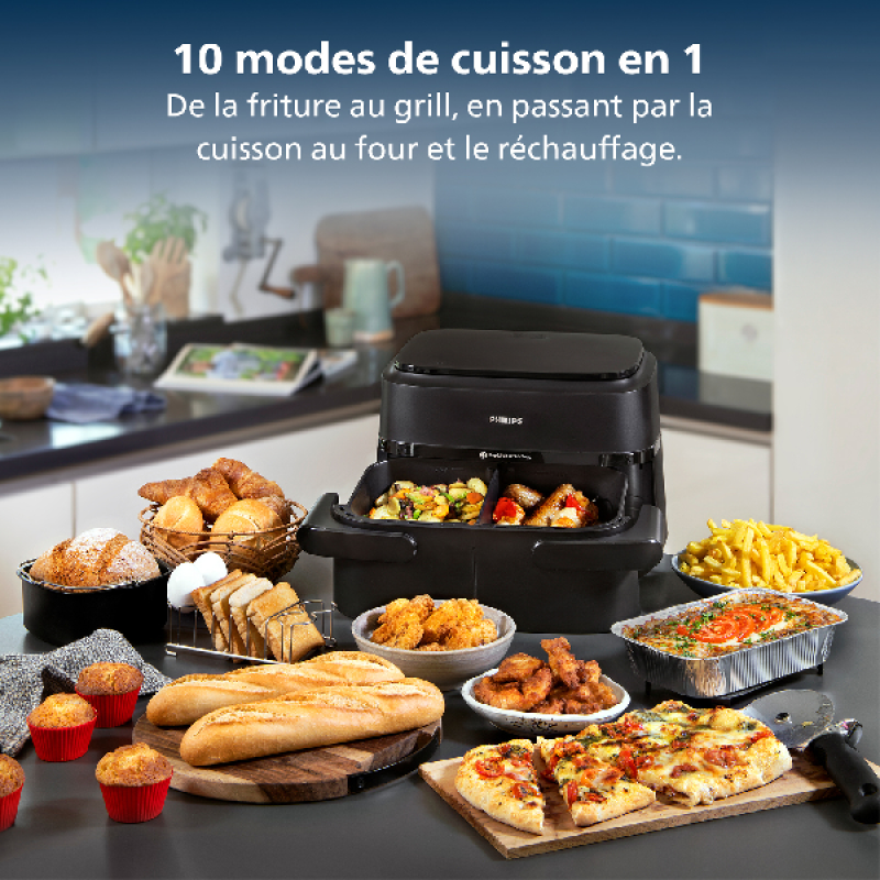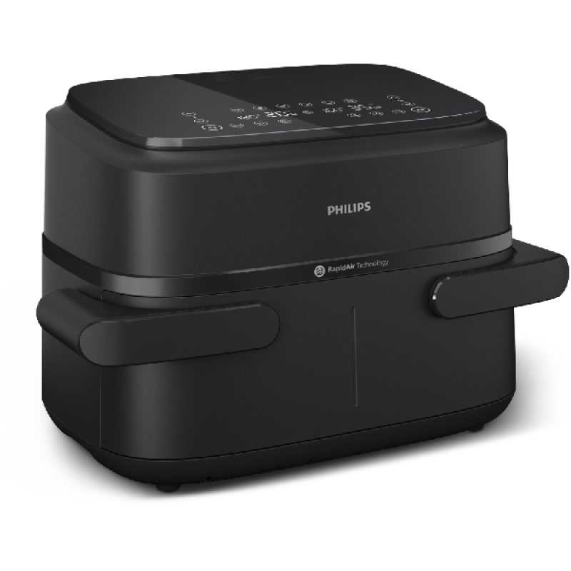Met de zwarte NA154/00 airfryer van Philips kun je je hele gezin verwennen dankzij het XXL-kookvolume van 7,1 liter. Ondanks het ruime volume is het een bescheiden apparaat van 30 x 30 x 44 cm, en past op zowat elk keukenaanrecht. Je kunt twee verschillende soorten ingrediënten tegelijk bereiden, met twee verschillende standen als je dat wilt, dankzij de twee kookmanden, of slechts één mand gebruiken, afhankelijk van hoeveel mensen er thuis eten. Het apparaat gebruikt zijn 2.450 watt en Rapid'Air-technologie om je friet, vlees, groenten of vis te bakken met tot 90% minder vet dan in een traditionele friteuse. Je krijgt knapperige resultaten die ieders smaakpapillen zullen verrukken. De airfryer verwarmt van 40 tot 200°C en biedt 10 kookstanden, gevarieerde recepten uit te proberen.