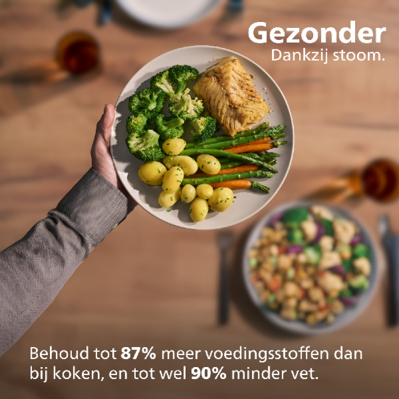 Deze airfryer van Philips biedt 12 voorgeprogrammeerde bakprogramma's voor diverse gerechten, van groenten tot gebak. Met de unieke stoomfunctie maak je met een druk op de knop gestoomde groenten, vis, rijst of dimsum met behoud van textuur en voedingsstoffen. Liever wat meer bite? Zet dan eenvoudig de airfry-stand aan voor een heerlijk krokant resultaat. Of laat beide functies samenwerken voor een complete maaltijd met de juiste balans tussen mals en knapperig. Zo combineer je stomen en bakken, zonder de nood aan extra toestellen in je keuken.