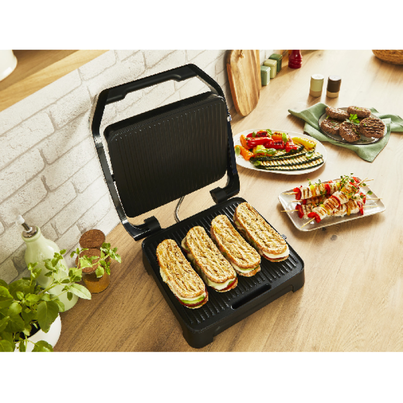 Tefal heeft deze multifunctionele grill ontworpen voor gezinnen die houden van gegrild eten. Hij heeft een groot formaat en een gegroefde kookplaat van 29 op 26 cm waar gemakkelijk 4 lekkere steaks of 2 panini's op passen. Je kunt er zowel vlees, groenten als tosti's op bakken. Hij heeft een modern design en is met zijn zwarte en stalen afwerking gemakkelijk schoon te maken. De grill heeft een stevig handvat om panini's aan te drukken en een haak om de 2 delen van de grill bij elkaar te houden als je er dikker voedsel in doet.