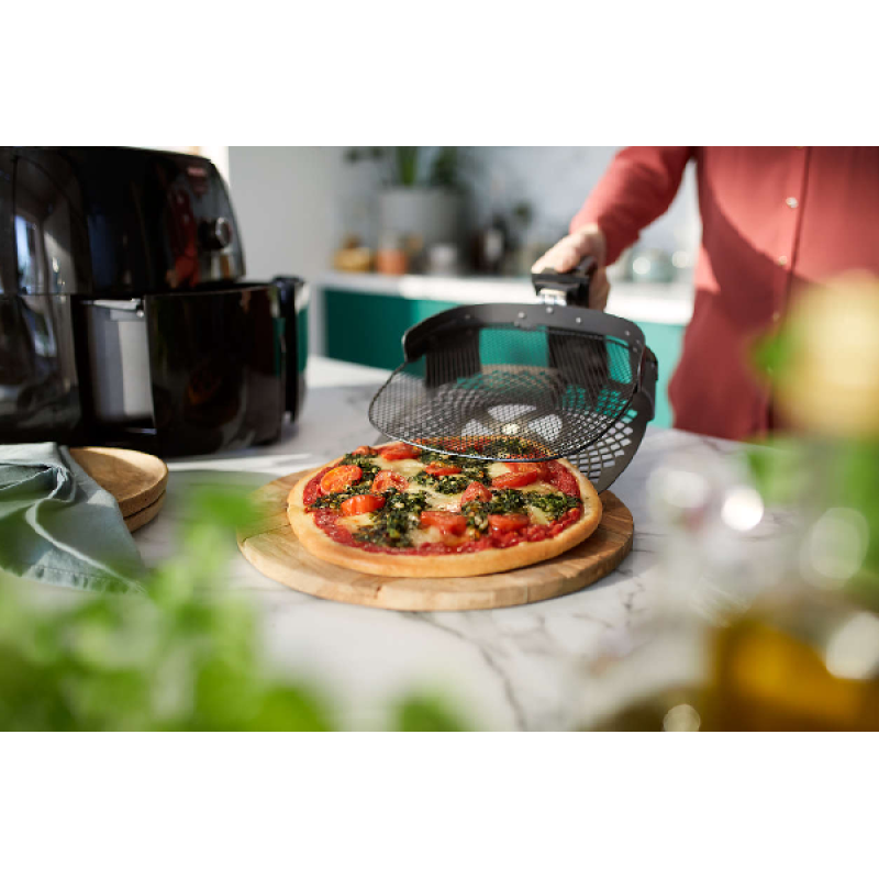 Nu kunt u met uw airfryer uw favoriete pizza bakken met de pizzaplaat. U kunt in slechts 8 minuten een zelfgemaakte pizza van 26 cm bakken of zelfs een bevroren kant-en-klaarpizza.