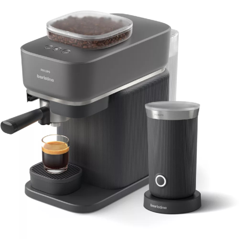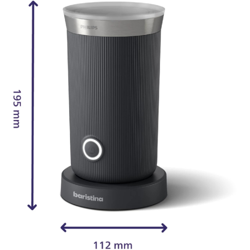Met een breedte van slechts 18 cm is deze kleine, zwarte Baristina BAR303/60 halfautomatische espressomachine van Philips compact maar krachtig. Dit apparaat maakt eenvoudig espresso's klaar die hun naam waardig zijn, met versgemalen bonen voor intensere smaken. Deze machine beschikt bovenaan over een bonenreservoir van 170 gram en een afneembaar waterreservoir van 1,2 liter. Dankzij het 122 watt vermogen genereert hij 16 bar druk aan de pomp voor de romigste koffies. Met zijn moderne design en aanpasbare kleuraccenten is deze kleine machine eenvoudig te gebruiken: je drukt op één knop, schakelt de filterhouder in en de Baristina doet de rest. Binnen enkele minuten is je koffie klaar. Het apparaat schakelt automatisch uit na een paar minuten. Voor cappuccinoliefhebbers wordt dit model geleverd met een praktische melkopschuimer voor het maken van glad, delicaat melkschuim.