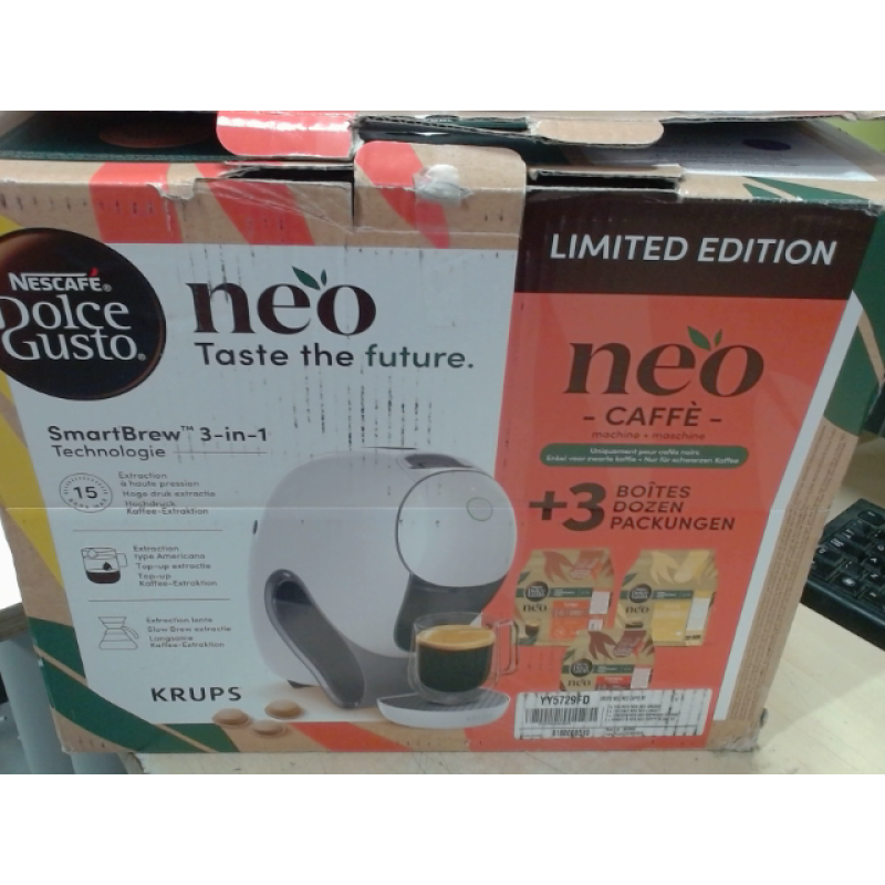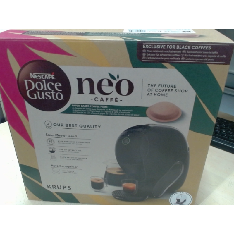 De Krups Nescafé Dolce Gusto NEO met zijn witte afwerking is een innovatieve koffiemachine ontworpen voor liefhebbers van kwaliteit en eenvoud. Hij is uitgerust met geavanceerde technologie en maakt gebruik van duurzamere NEO-capsules die een rijkere koffie-ervaring bieden. Bovendien is hij intelligent en gebruiksvriendelijk: plaats de capsule van je keuze in de machine, de machine herkent deze automatisch en past de hoeveelheid water en de temperatuur dienovereenkomstig aan, voor een optimaal resultaat zonder handmatige instellingen. Met de Dolce Gusto Neo kun je een breed scala aan dranken bereiden, zoals espresso, lungo, cappuccino, warme chocolademelk en nog veel meer. Het apparaat heeft een vermogen van 1500 watt en een druk van 15 bar en haalt kopje na kopje het beste uit de aroma's, voor een rijke smaak en een dikke crème. Met zijn milieuvriendelijke ontwerp combineert het apparaat prestaties met respect voor het milieu. Ten slotte past het strakke ontwerp gemakkelijk in je keuken en maakt de intuïtieve interface het gebruik supereenvoudig.