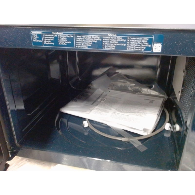 De Samsung MS32DG4504AGE1 is een krachtige magnetron met een stijlvolle zwarte afwerking. Het moderne ontwerp wordt gecombineerd met een royale capaciteit van 32 liter, waardoor er voldoende ruimte is voor grote ovenschalen — perfect voor gezinnen. De vlakke deur met roestvrijstalen afwerking en verzonken handgrepen aan de boven- en onderkant maakt openen extra eenvoudig. Bovendien zorgt het glazen draaiplateau van 31,8 cm voor een gelijkmatige garing en voldoende ruimte voor grote gerechten. Een betrouwbare partner voor al je culinaire avonturen.