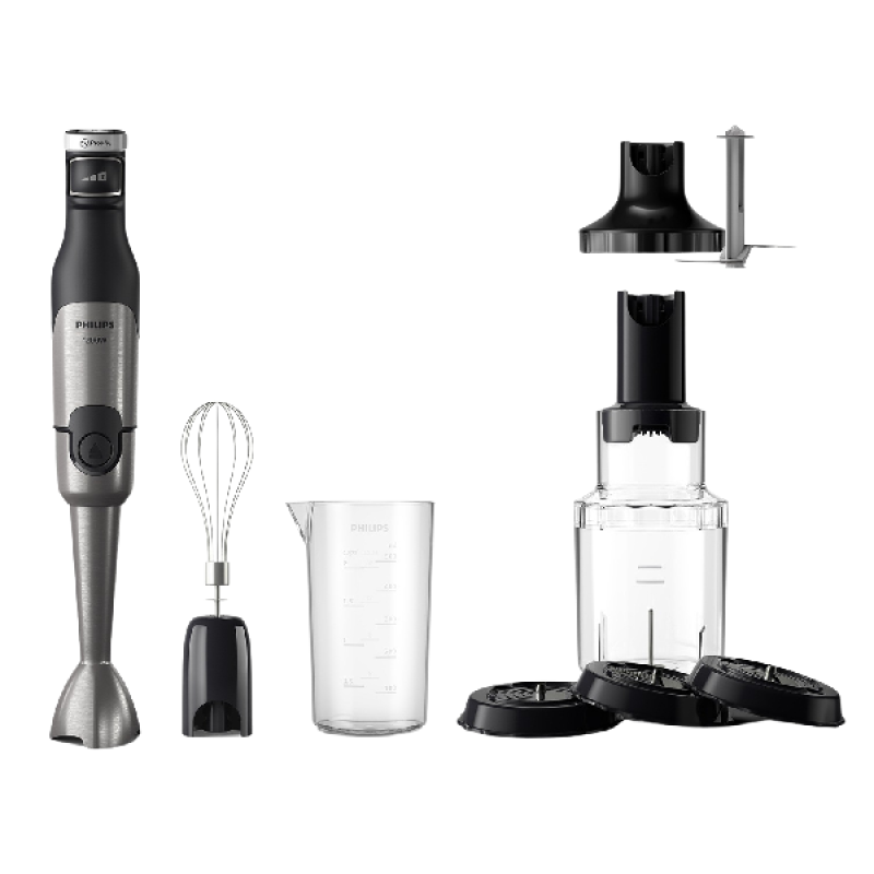 Met deze zwarte Philips staafmixer- hakmolen- en spiralizer heb je een complete set keukengerei in handen. Op de mixerbehuizing met motor passen alle accessoires om alle ingrediënten die je maar wilt te mixen, malen, hakken en raspen. Met de hakarm kun je moeiteloos groenten fijnmalen om soepen te maken en elk ander mengsel mengen om quiches en taarten te bereiden. Met de garde klop je eiwitten op en met de minihakmolen en de meegeleverde raspen kun je allerlei groeten en kruiden fijnhakken en raspen. De staafmixer heeft een ergonomisch ontwerp en ligt perfect in de hand. Dankzij het maximale vermogen van 1.200 watt draait hij met gemak de 2 versnippersnelheden. Alle accessoires zijn vaatwasmachinebestendig voor een eenvoudige reiniging.