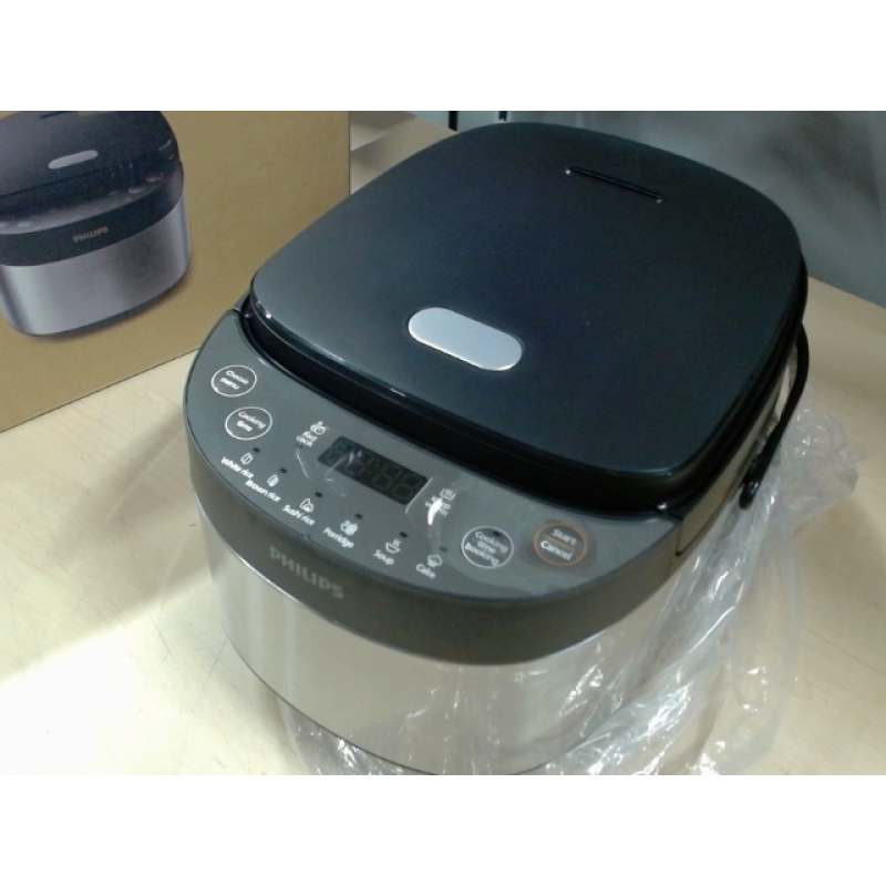 Met deze rijstkoker van Philips in zwart en zilver kook je rijst met gemak tot in de perfectie. Hij heeft verschillende kookstanden, afhankelijk van wat je precies wilt koken (witte rijst, bruine rijst, sushirijst, havermout) en je kunt er zelfs soepen en cupcakes mee maken. Je kunt het apparaat in een paar klikken instellen op het digitale bedieningsscherm. Hij heeft 600 watt vermogen, een 80 cm lang netsnoer en een warmhoudfunctie. Met zijn bescheiden afmetingen van 20 x 25 x 37 cm kun je hem op je werkblad zetten en opbergen zoals je wilt. Het rijstmandje, de maatbeker, de lepel en het stoommandje zijn vaatwasmachinebestendig.