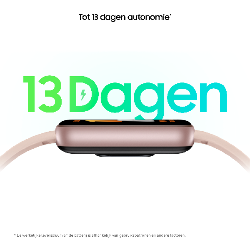 De Galaxy Fit 3 is gebouwd om lang mee te gaan. Met een batterijcapaciteit van 208 mAh gaat het apparaat tot 13 dagen mee op een volle lading. De activity tracker is water- en stofbestendig waardoor je hem zonder zorgen kunt dragen tijdens al je activiteiten. Bovendien bieden de verwisselbare bandjes je de mogelijkheid om de tracker aan te passen aan je persoonlijke stijl zodat hij altijd discreet aan je pols hangt.