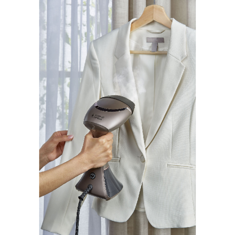 De bruine Russell Hobbs Steam Genie Aroma kledingstomer verwijdert snel en makkelijk kreukels uit je kleding. Zo ervaar je het gemak van kreukvrije kledij, zonder dat je een strijkplank hoeft op te stellen. De handstomer biedt dankzij zijn ergonomische ontwerp comfortabele stoommogelijkheden in elke positie. Hij is immers erg gebruiksvriendelijk en licht van gewicht. Het apparaat heeft een vlot uitneembaar waterreservoir van 200 ml met een ruime opening. Hierdoor vul je het gemakkelijk bij onder de kraan. Je hoeft enkel de stekker in het stopcontact te steken en het toestel is in slechts 45 seconden klaar om te stomen. Zo heb je in geen tijd weer een kraaknette outfit.