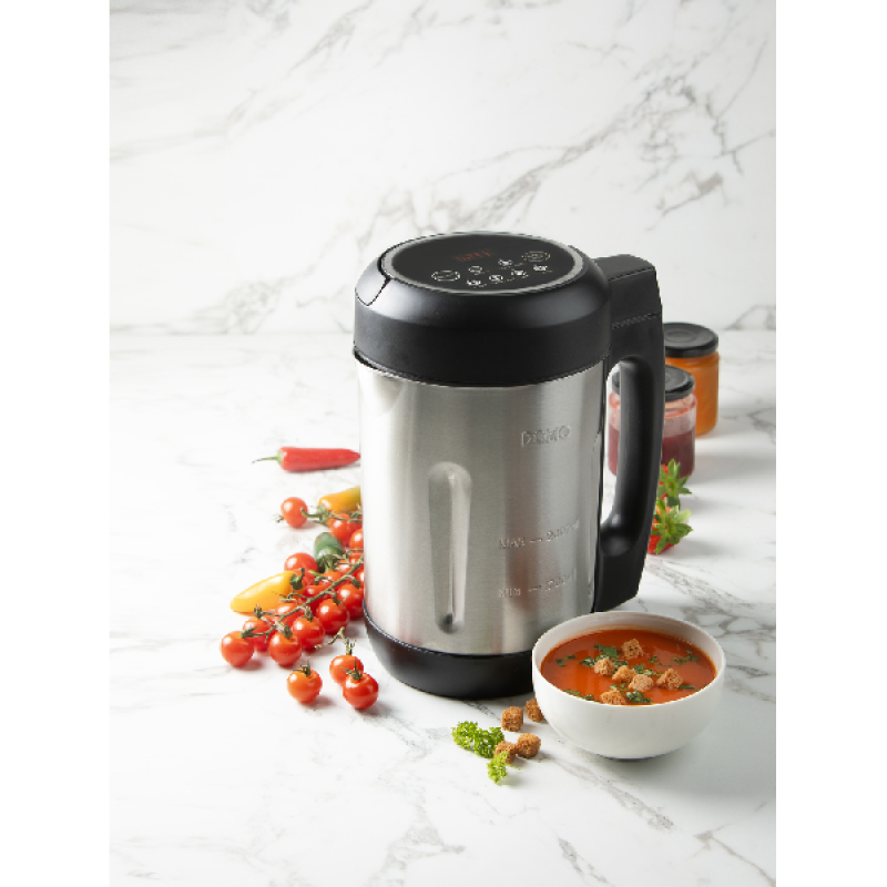 De Domo soepmaker heeft een inhoud van 2 liter en stelt je in staat om met gemak allerlei soepen, confituren of sappen te maken. De machine is uitgerust met een roestvrijstalen container en een digitaal led-display en wordt bediend via het knoppenpaneel op het deksel. Je kunt dan zelf bepalen welke textuur je voor je soep wilt, van extra zacht tot grof. Het deksel is voorzien van messen die je groenten of fruit in een handomdraai mengen voor romige resultaten die je smaakpapillen zullen verrukken.