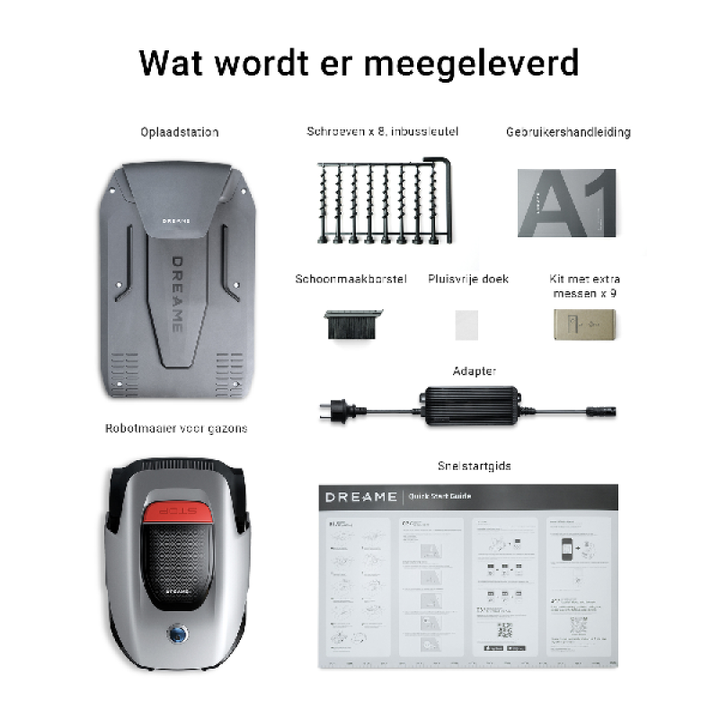 De Dream A1 Pro is ontworpen met onderhoudsgemak in gedachten. Dankzij de IPX6-certificatie is de maaier bestand tegen regen en maak je hem eenvoudig schoon door hem, indien nodig, af te spoelen met water. Voor extra bescherming tegen weersinvloeden heeft Dreame een speciale garage (apart verkrijgbaar) ontworpen om de levensduur van je robotmaaier te verlengen. Bovendien wordt de maaier geleverd met handige accessoires zoals een schoonmaakborstel, schroeven, kit met extra messen en een pluisvrije doek, zodat je het toestel eenvoudig kunt onderhouden en reinigen.