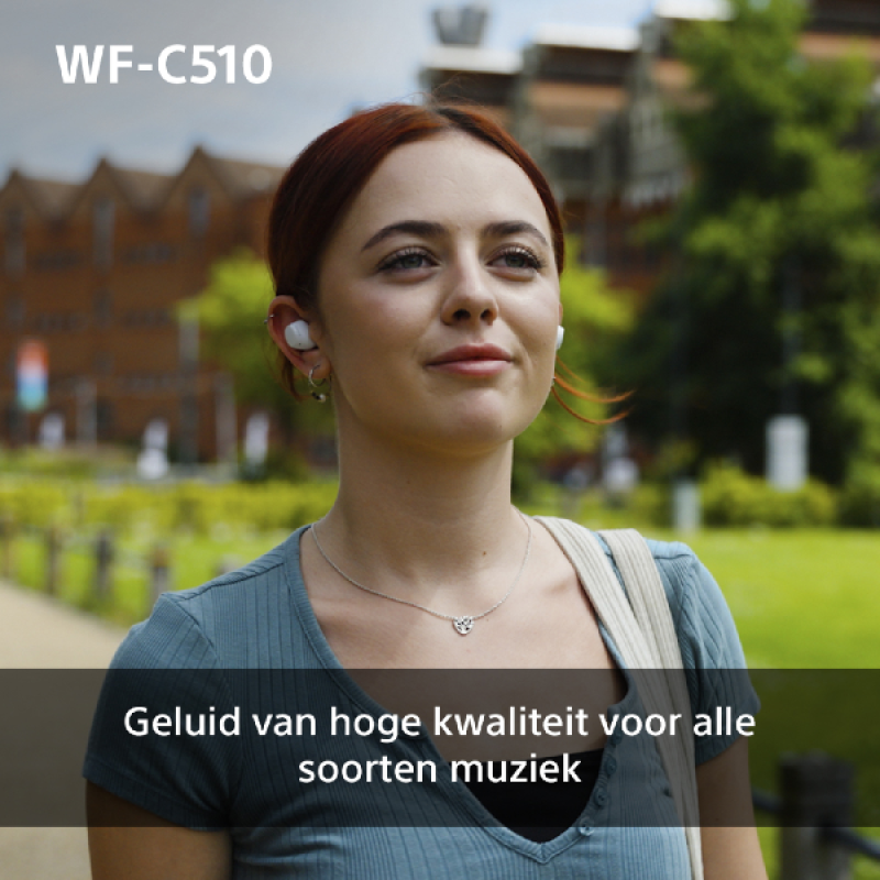 De witte Sony WF-C510 draadloze oortjes zijn compact, kleurrijk en uitgerust met functies voor een uitstekende geluidskwaliteit, altijd en overal. Ze zijn licht en ergonomisch, met een ideale pasvorm die de hele dag comfortabel aanvoelt, voor een universele luisterervaring.