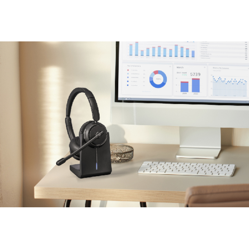De zwarte draadloze headset IHS-8200 van het merk ISY is ideaal voor professioneel gebruik. Met deze headset voer je steeds heldere gesprekken en ben je altijd goed verstaanbaar tijdens online vergaderingen en gesprekken. Je verbindt deze hoofdtelefoon draadloos via bluetooth met je PC of laptop, zo heb je dus geen last van kabels. Hij is voorzien van on-ear-oorschelpen die comfortabel op je oren rusten, en dankzij passieve ruisonderdrukking worden storende geluiden, met hoge frequentie weggefilterd. Bovendien kun je dankzij de geïntegreerde volumeregelaar het volume altijd snel wijzigen. Volledig opgeladen gaat de headset ongeveer 26 uur mee, om hem op te laden gebruik je het oplaadstation, na 2 uur is hij weer gebruiksklaar.