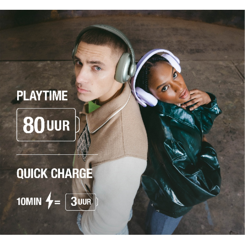 Je profiteert van een volle klank met een strakke bas en heldere hoge tonen, waardoor elk nummer precies klinkt zoals het moet klinken. De multipoint Bluetooth-verbinding maakt het mogelijk om 2 apparaten tegelijk op je koptelefoon aan te sluiten, bijvoorbeeld je telefoon en je laptop. Zo switch je soepel tussen verschillende apparaten. De hoofdtelefoon biedt een indrukwekkende draadloze afspeeltijd van 80 uur, zo zit je geen seconde zonder muziek. In slechts 2 uur is hij volledig opgeladen en met maar 10 minuten snelladen verkrijg je terug 3 uur gebruik.