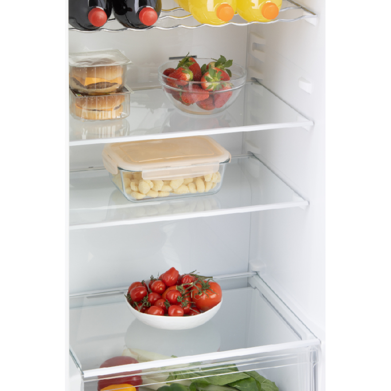 De koelkast heeft een inhoud van 322 liter, wat ruim voldoende is voor al jouw verse voedingswaren. Binnenin heeft hij 5 glazen legplateaus en 2 vershoudlades onderaan, plus 4 bakken in de deur voor flessen, blikjes en potten. De legplateaus zijn eenvoudig te verwijderen indien je meer ruimte nodig hebt voor grote producten. Verder kan je op het handige flessenrek tot 5 grote flessen kwijt, zodat je steeds gekoelde dranken tot je beschikking hebt. De bediening verloopt via het gebruiksvriendelijk display met elektronische temperatuurregeling dat zich binnenin het toestel bevindt.