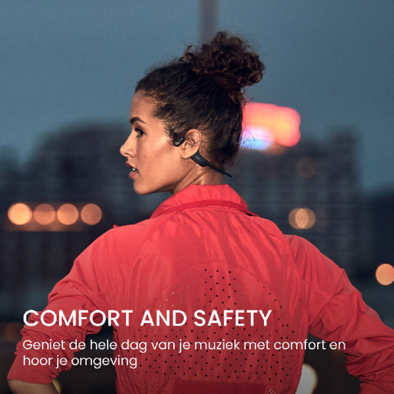 OpenRun is gemaakt van titanium bedekt met zachte siliconen – hij is licht en weegt slechts 26 gram en comfortabel om te dragen, zodat je vergeet dat je hem op hebt. Je plaatst hem comfortabel op het hoofd, en dankzij zijn ergonomische ontwerp, blijft hij in elke situatie goed zitten. Je kunt hem gebruiken tijdens het hardlopen, wandelen, fietsen of in de sportschool. Dankzij het geoptimaliseerde ontwerp past het perfect om je oren en garandeert het een uitstekende stabiliteit. Het oorstukje is perfect gepositioneerd bij de ingang van de gehoorgang zodat je alles duidelijk kunt horen. Het open oorontwerp staat niet alleen garant voor heldere muziek, maar laat ook het verkeerslawaai door zodat je altijd weet wat om je heen gebeurt.