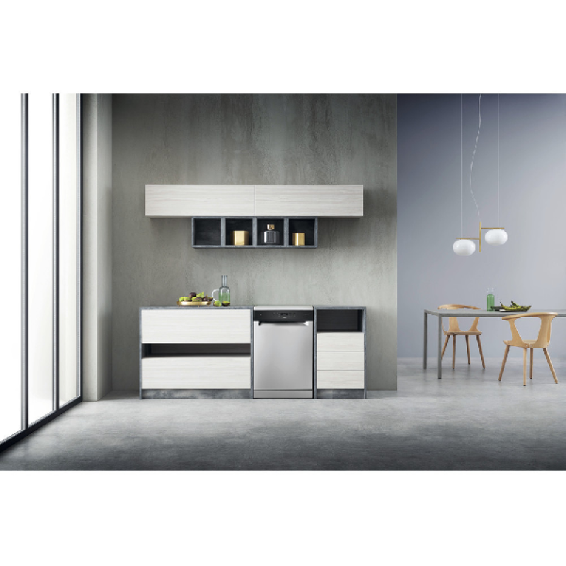 De Whirlpool Vaatwasser D is een erg aanpasbaar vrijstaand toestel. Je kan de binnenkant op meerdere manieren afstellen op de vaat van de dag. Je potten en pannen kunnen er verticaal in geplaatst worden, zodat er 10 extra borden in het onderste rek passen. In totaal biedt de vaatwasser plaats voor wel 14 couverts. Dankzij de modulaire manden, het verstelbare bovenrek en inklapbare elementen kan je de machine bovendien naar wens indelen. Verstelbare voetjes en een verwijderbaar bovenblad zorgen dan weer dat je de vaatwasser makkelijk in je keuken installeert.