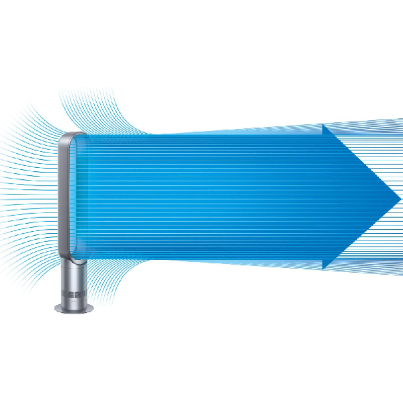 Een ringvormige luchtstroom versnelt de omringende lucht en versterkt deze. Er zijn geen bladen die in de lucht hakken, zodat een gladde luchtstroom koelt zonder onaangename trillingen.