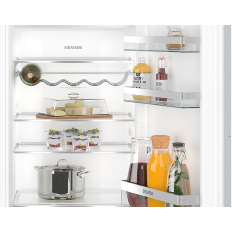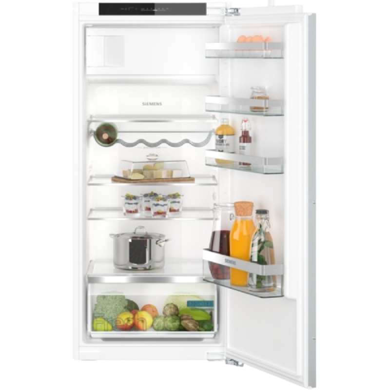 De KI42LVFE0 inbouwkoelkast van Siemens zal discreet staan in een moderne inbouwkeuken. Met zijn standaardafmetingen van 54,1 x 122.1 x 54,8 cm past hij gemakkelijk in een standard keukenkast. Hij heeft een omkeerbare deur waarmee je de openingsrichting kan aanpassen aan de opzet van je keuken. Deze koelkast biedt een totaal volume van 187 liter en heeft ook een klein vriesvak bovenin van 15 liter. Binnenin beschikt hij over 5 ultrabestendige glazen plateaus waarvan 4 in hoogte verstelbaar zijn. Zo kan je de opslagruimte naar eigen inzicht verdelen en organiseren. Onderaan bevinden zich 1 vershoudlade, ideaal voor het bewaren van groenten en fruit. De deur bevat 4 bakken voor een optimale organisatie van al je potten en flessen. De binnentemperatuur kan je eenvoudig met het bedieningspaneel aan de binnenkant van de deur aanpassen. Bovendien heeft de koelkast een LED-verlichting aan de voorzijde waardoor je altijd kan zien wat er in zit.