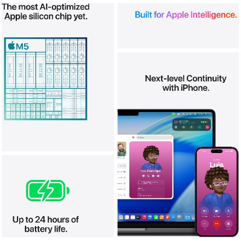 De 14 inch MacBook Pro met de M5-chip is sneller dan ooit en uitgerust met krachtige on device AI voor al je persoonlijke, professionele en creatieve projecten. Met tot wel 24 uur batterijduur en een Liquid Retina XDR display. Gemaakt voor Apple intelligence (ook binnenkort beschikbaar in het Nederlands) die je helpt je schrijven, jezelf uitdrukken en dingen moeiteloos voor elkaar krijgen, presteer hij beter dan ooit tevoren.