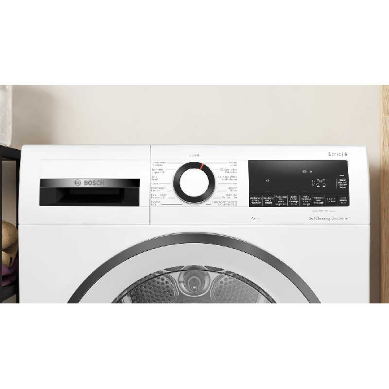 De Bosch warmtepompdroger WQG235DEFG in wit heeft een modern en compact design dat naadloos in je interieur past. Deze droger combineert esthetiek en gebruiksgemak om aan je dagelijkse behoeften te voldoen. De trommel van 112 liter biedt een capaciteit van 8 kg, ideaal voor gezinnen of grote wasbeurten. De speciaal ontworpen peddels zorgen voor een delicate behandeling van textiel, verminderen kreukvorming en behouden de kwaliteit van je kleding. Bovendien maakt de zijdelingse deur met scharnieren aan de rechterkant het in- en uitladen eenvoudig.