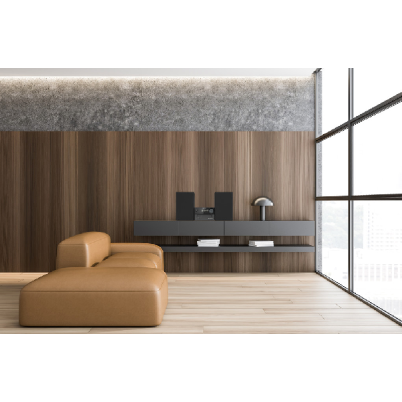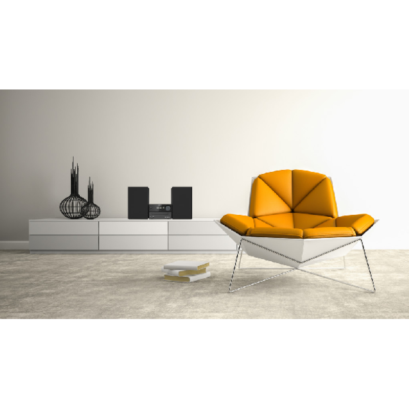 Het micro audiosysteem is bijzonder compact en past op kleinere meubelstukken zoals een bijzettafel. Je kan hem zelfs op een boekenplank plaatsen, of in een rek. In zijn geheel is de keten niet breder dan 44 cm en het grootste element, de besturingseenheid, is slechts 25 cm diep. Alles samen weegt hij niet meer dan 5,2 kg, zodat je hem makkelijk installeert en verplaatst. Zo verhuis je de keten bijvoorbeeld makkelijk naar de huiskamer tijdens een feestje. Ook afstoffen rond het toestel is op een-twee-drie gedaan.