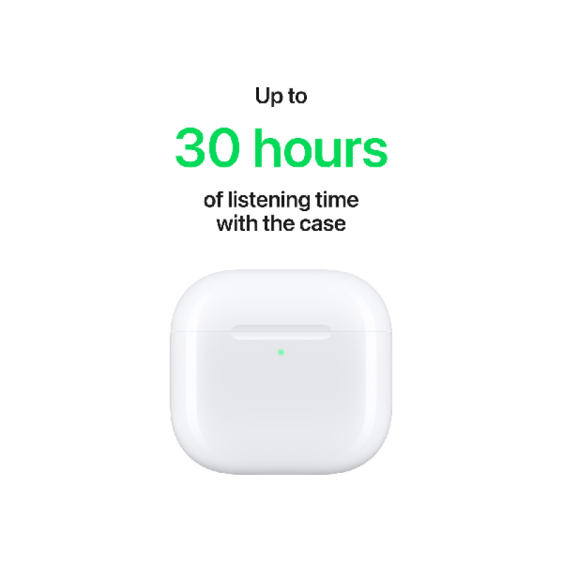 De gestroomlijnde oplaadcase is meer dan 10 procent compacter dan die van de vorige generatie, terwijl het opladen nog steeds even snel gaat. AirPods 4 met actieve ruisonderdrukking hebben de kleinste draadloos oplaadbare case op de markt, die dankzij een ingebouwde speaker makkelijk terug te vinden is met ‘Zoek mijn’. De oortjes bieden tot 30 uur luistertijd met de case en tot 5 uur luistertijd na één keer volledig opladen.