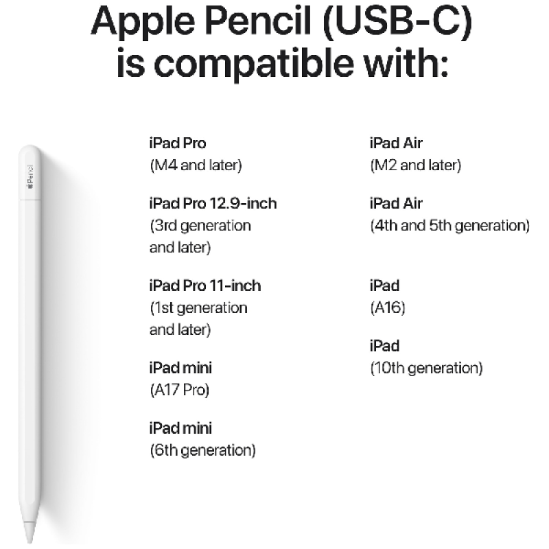 Er wordt geen USB-C-kabel meegeleverd. Indien de iPad niet in bovenstaande lijst staat dan werkt de Apple Pencil niet op de iPad