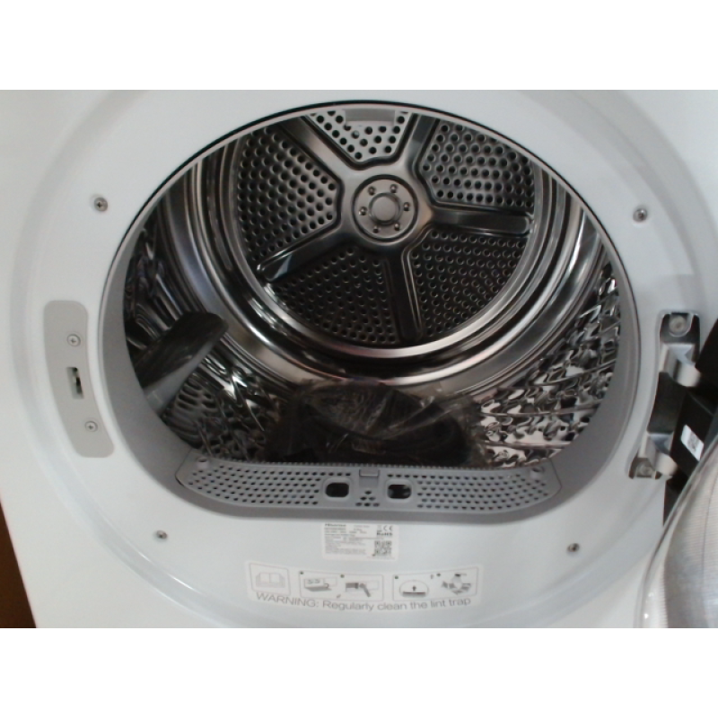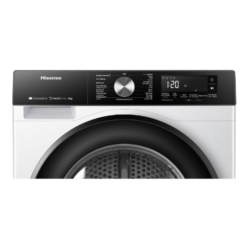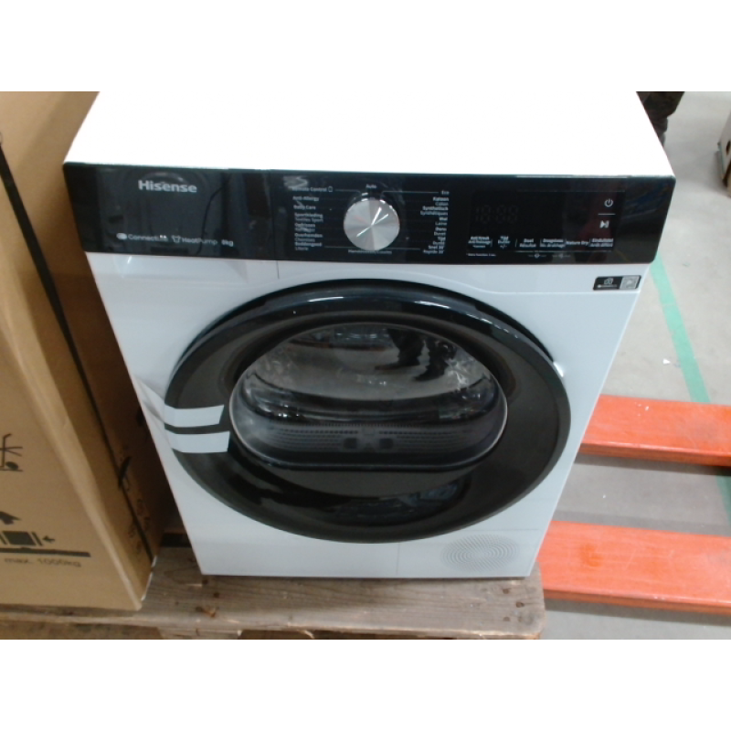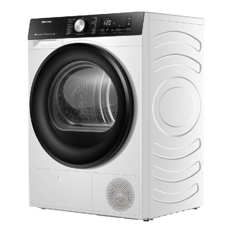 De Hisense DH3S802BW3 warmtepomp-droogkast valt op door zijn strakke witte design en stijlvolle zwarte deur, wat je wasruimte een moderne, verzorgde uitstraling geeft. Dankzij de compacte afmetingen van 59,5 x 85 x 55 cm (B/H/D) schuif je het toestel makkelijk onder een werkblad of naast je wasmachine. De trommel beschikt over een capaciteit van 8 kilo en biedt voldoende ruimte voor het wasgoed van een gemiddeld huishouden - van kledij tot handdoeken en beddengoed.